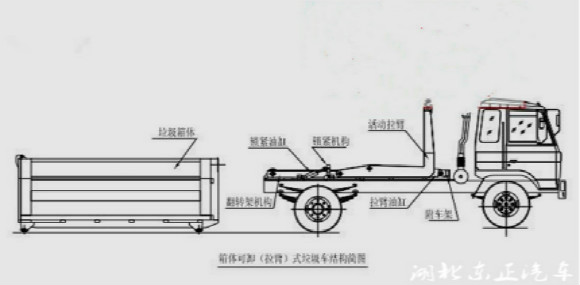 勾臂式垃圾車可將地下垃圾箱內(nèi)的垃圾及垃圾箱一同拉至車上運走同時可自卸,降低了工人的勞動強度。該垃圾車的收運方式是目前世界上廣泛采用的垃圾收運方式,可以實現(xiàn)一車多 箱,大大降低了配備成本和空間等等;其專用裝置的功能均以汽車發(fā)動機為動力,通過液壓機構(gòu)手動或電控來實現(xiàn)。車輛的箱體采用優(yōu)質(zhì)炭鋼板全密封焊接結(jié)構(gòu),具有強度高、重 量輕、不產(chǎn)生二次污染等優(yōu)點。