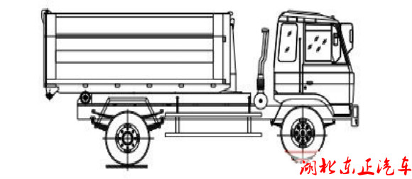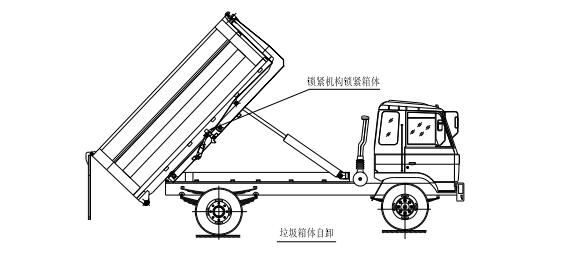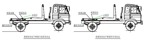 該車是由汽車底盤、拉臂主油缸、附車架、翻轉(zhuǎn)架、支撐腿(選裝)、鎖緊架、鎖緊油缸及多路換向閥等組成。翻轉(zhuǎn)架一端連在附車架上,其另一端設(shè)有活動拉臂,中間安裝有 鎖緊系統(tǒng);活動臂油缸一端連在活動臂上,另一端連接在附車架上;鎖緊機構(gòu)通過鎖緊油缸的動作可以在箱體自卸時將附車架上的箱體與翻轉(zhuǎn)架及拉臂連為一體,在主油缸伸出時 形成自卸角,也可以通過鎖緊油缸的收回把翻轉(zhuǎn)架與附車架鎖緊為一體,利用主油缸的收回或伸出使活動拉臂將地下的垃圾箱拖拉至附車架上或從附車架上放回到地面。