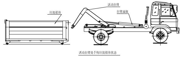 步驟 2.將拉臂操作手柄拉起到伸起位置,拉臂油缸伸出,活動拉臂繞翻轉(zhuǎn)翻轉(zhuǎn)架前鉸鏈軸旋轉(zhuǎn),拉臂處于鉤箱位置,適當調(diào)整拉臂鉤高度并與箱體彎鉤對準;如圖: