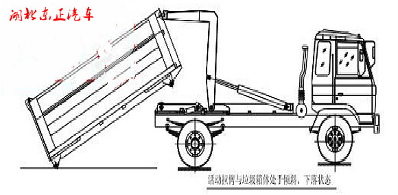 步驟 3.當拉臂鉤鉤到箱體彎鉤時,繼續(xù)推下拉臂操作手柄到落下位置,使垃圾箱體繼續(xù)上車(注意:保證垃圾箱體的縱梁位于附車架尾部兩后滾輪之間);如圖: